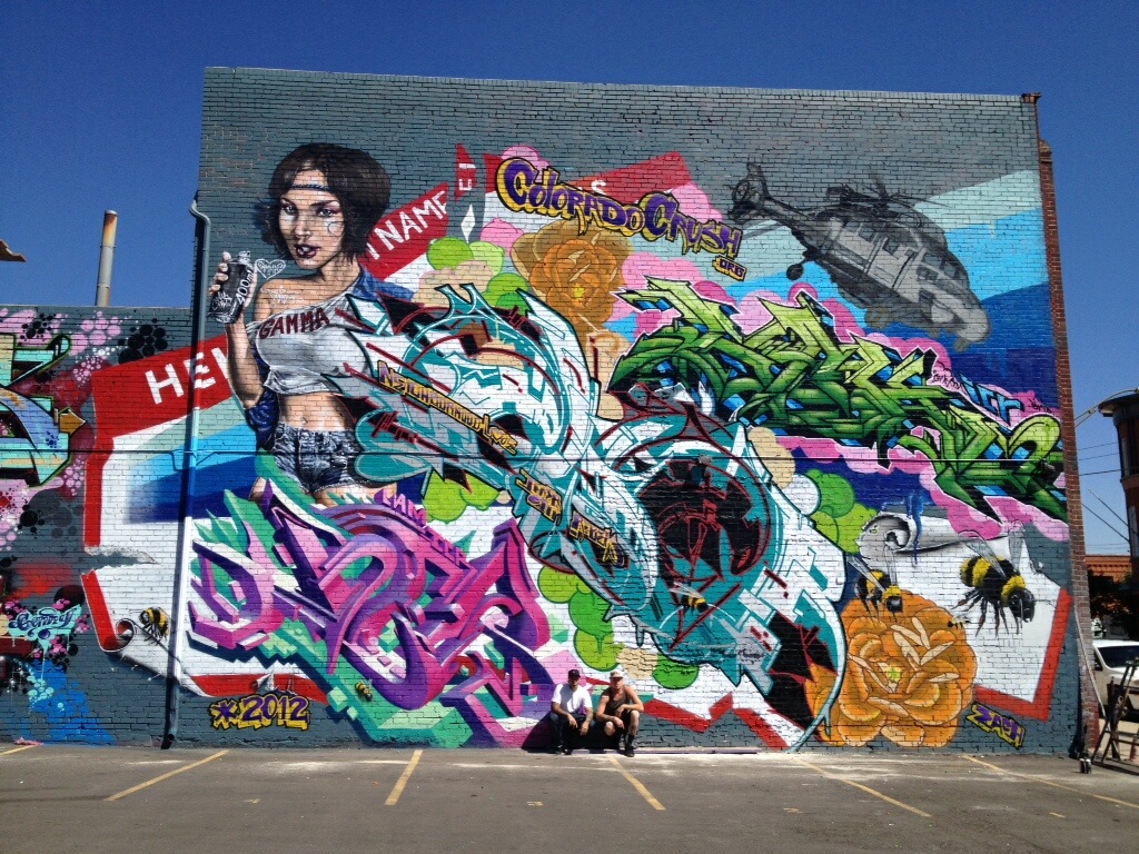 A vibrant mural in the alleyway between 26th and 27th on Larimer Street, marking the origins of the Crush mural series that transformed RiNo into one of Denver's premier street art destinations.