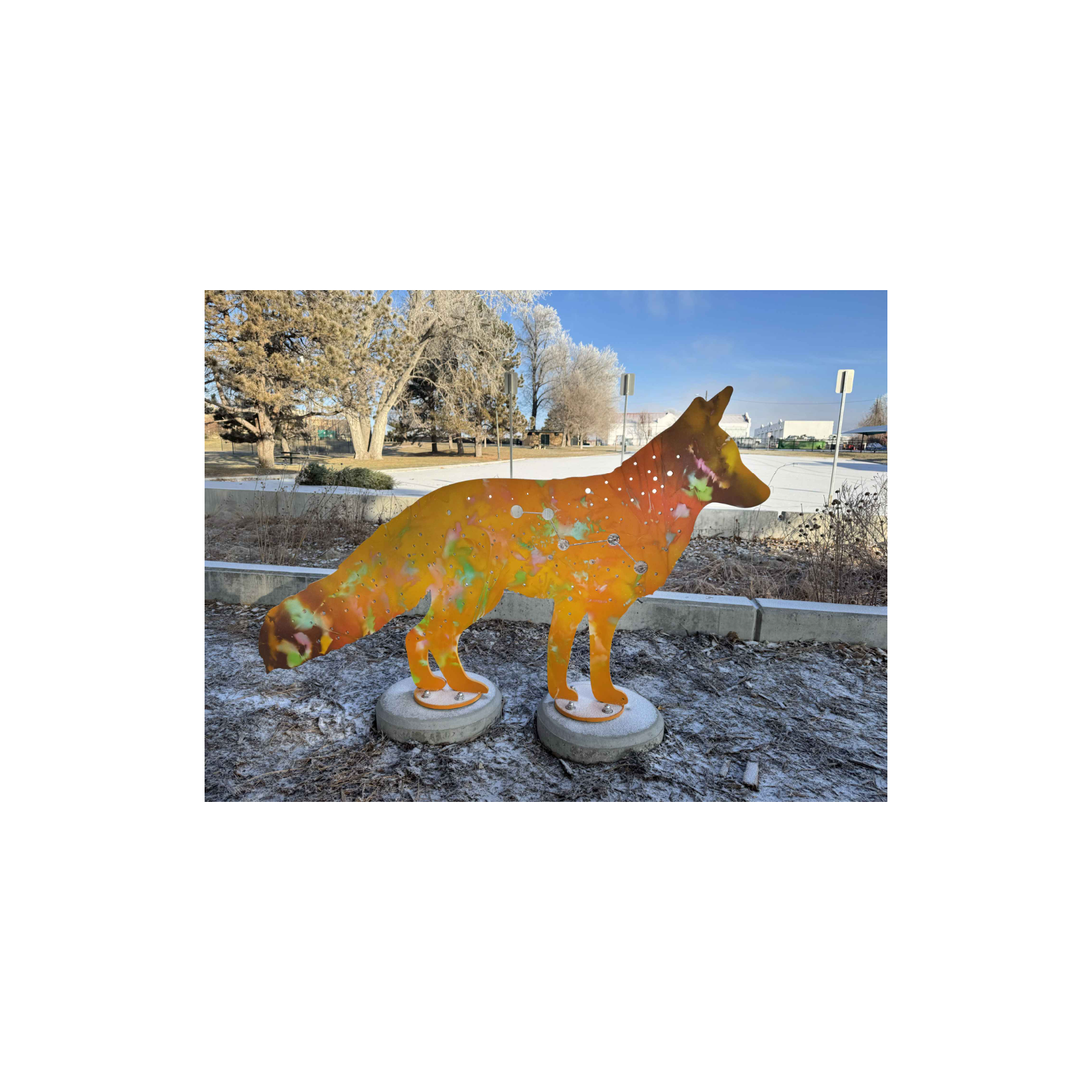 Sculpture: Constellations: Bear (Ursa Major), Crane (Grus), and Fox (Vulpecula) by Christine Nguyen (2024), stainless steel, spray paint, acrylic in Congress Park, Denver