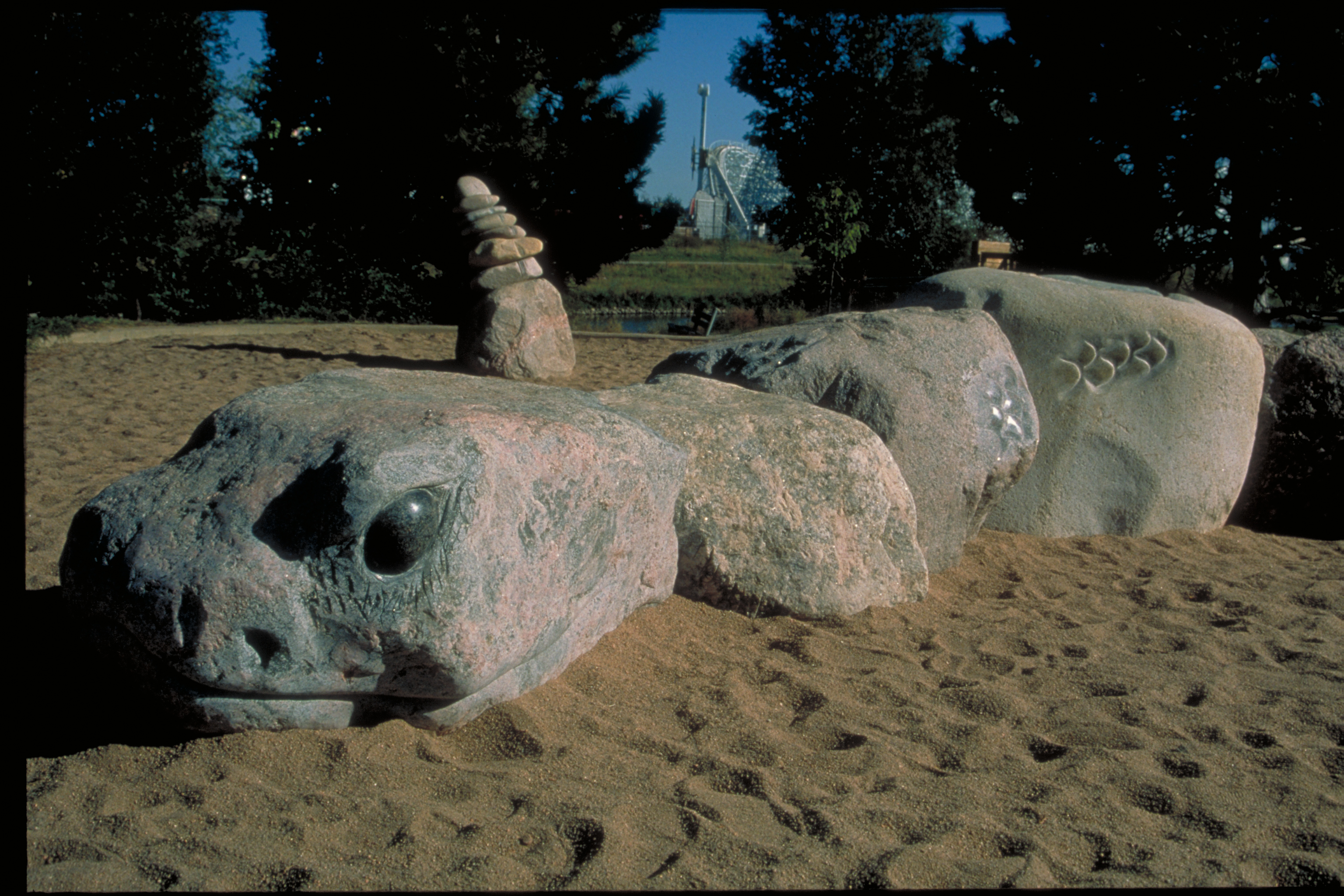A series of large river boulders with minimal carvings of native animals, arranged to invite children to use their imagination. Set within Gates Crescent Park near the Children's Museum, evoking the South Platte River corridor.