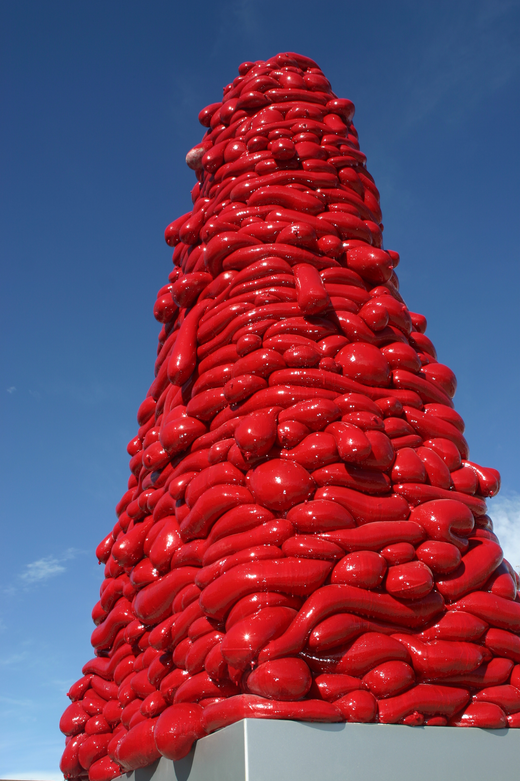 John McEnroe is a contemporary sculptor known for works using unconventional construction methods. His 20-foot obelisk near the Highland Pedestrian Bridge features an aluminum base topped with a red fiberglass shell that is internally lit.